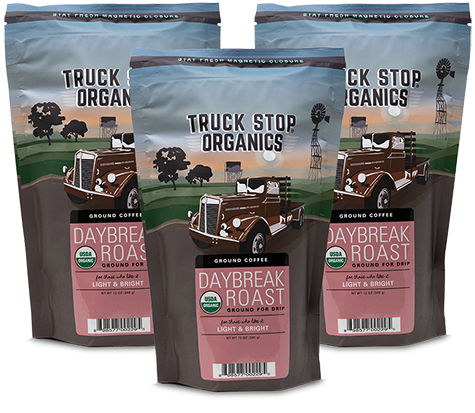 I like darker coffees—is Daybreak Roast for me? This ground medium roast is Truck Stop Organics’ lightest roast. We suggest trying our Big Rig Roast or our Rumble Strip Espresso if you’re looking for a dark roast coffee.