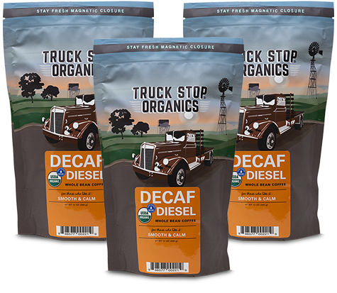 Truck Stop Organics: Decaf Diesel Whole Bean Coffee - You will receive a 3-pack of Decaf Diesel Whole Bean Coffee 12oz bags with a recurring monthly subscription.